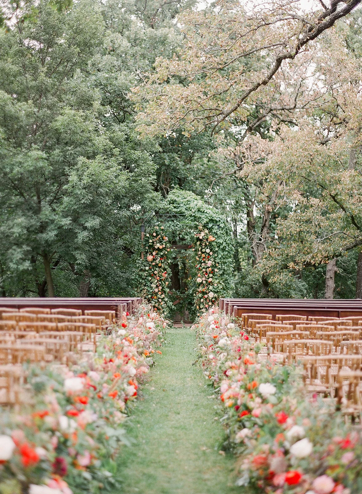 Outdoor wedding aisle decorated with flowers on both sides leading to a floral arch in a lush green garden.