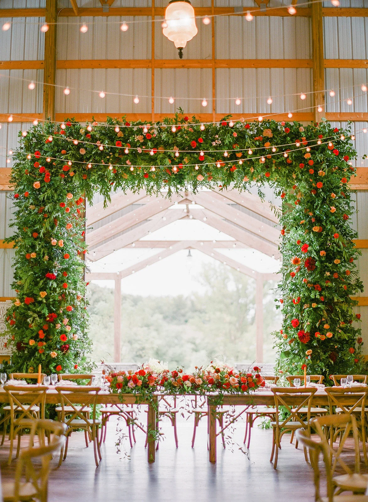Wedding or event altar decorated with greenery and red flowers, with string lights hanging above inside a wooden barn or hall.